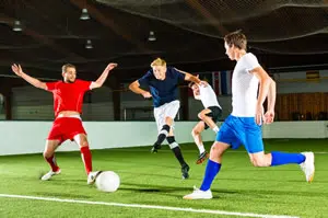 Die Fußballhalle ist mit einem speziellen Kunstrasen ausgestattet, so dass ihr nicht auf einem harten Hallenboden spielen müsst. Es kommt richtiges „Rasen-Feeling“ auf, so gut ist der Hallenfußball Kunstrasen in Grevenbroich. Doch das ist längst noch nicht alles, was euch in der Soccerhalle Grevenbroich erwartet: